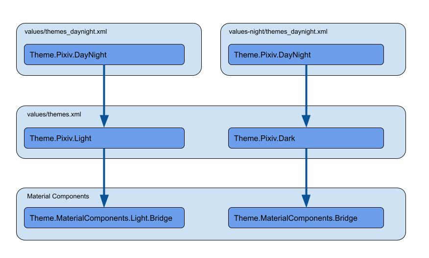 上記のように定義した Theme.Pixiv.DayNight を利用すると、ダークテーマ無効時は Theme.Pixiv.Light 、ダークテーマ有効時は Theme.Pixiv.Dark を参照するようになります。 この代替リソースの仕組みを利用して Theme を切り替えることで、 属性に紐づける色リソースの切り替えを実現します。