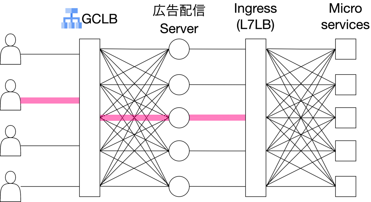 また、広告配信サーバーとマイクロサービス間の通信はService(ClusterIP)でのロードバランシング(TCP(L4))が行われており、広告配信サーバーからマイクロサービスに対してKeep-Aliveが行われていました。