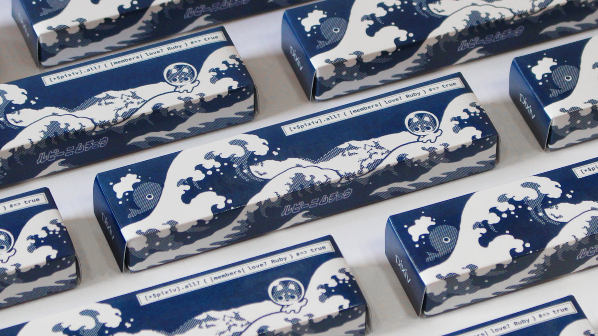 他にもこだわりがあって、パッケージ表面には [*$pixiv].all? { |members| love? Ruby } という、英語として読めるRubyコードがプリントされていました。このコードは実行してもちゃんと true になります!