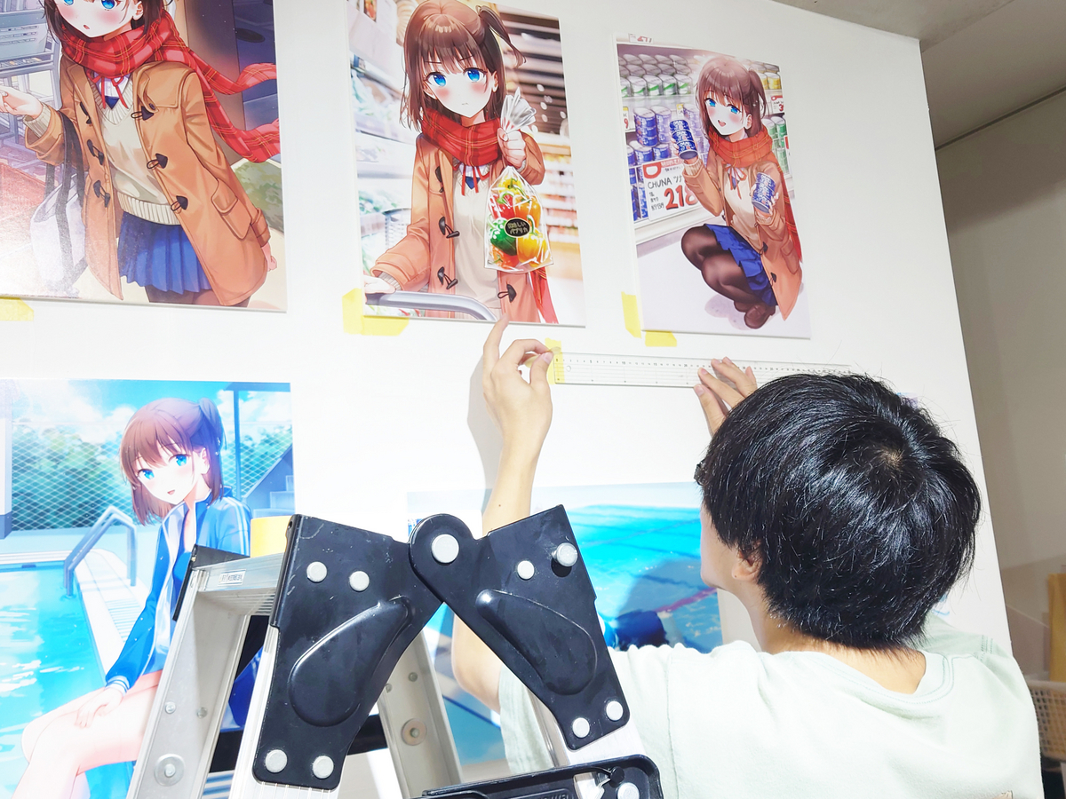 展示物の大半を占めるのは、壁に貼られるイラストパネルたち。何十枚もの作品を綺麗に見せるために、事前に作成されたレイアウト図を確認しながら壁面にマスキングテープで印をつけていきます。