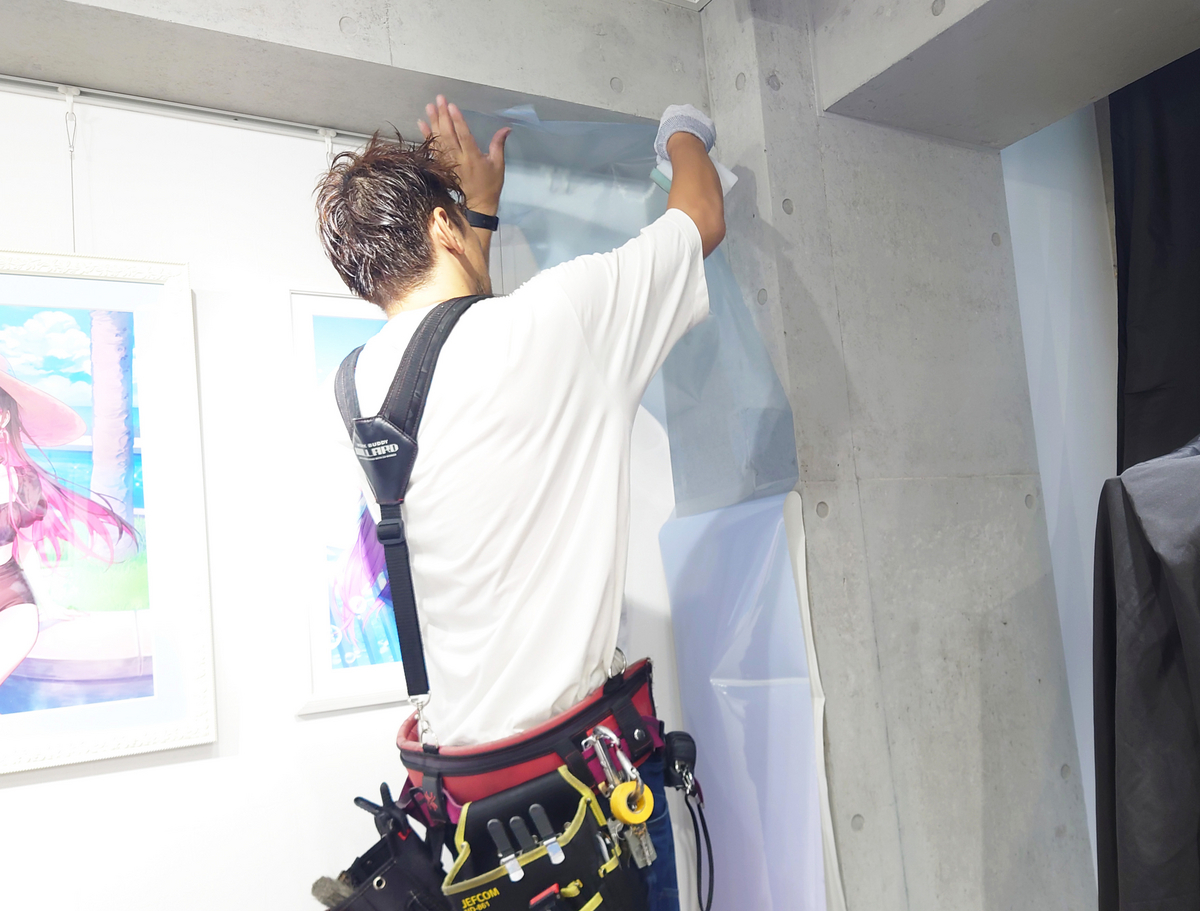 入口側のガラス壁へのラッピング装飾は、会場の顔になる部分。個展のキービジュアルが印刷されたシートを内側から貼っていきます。シワが入らないように伸ばしながら貼る手つきは鮮やか!あっという間にガラス面が装飾されました。