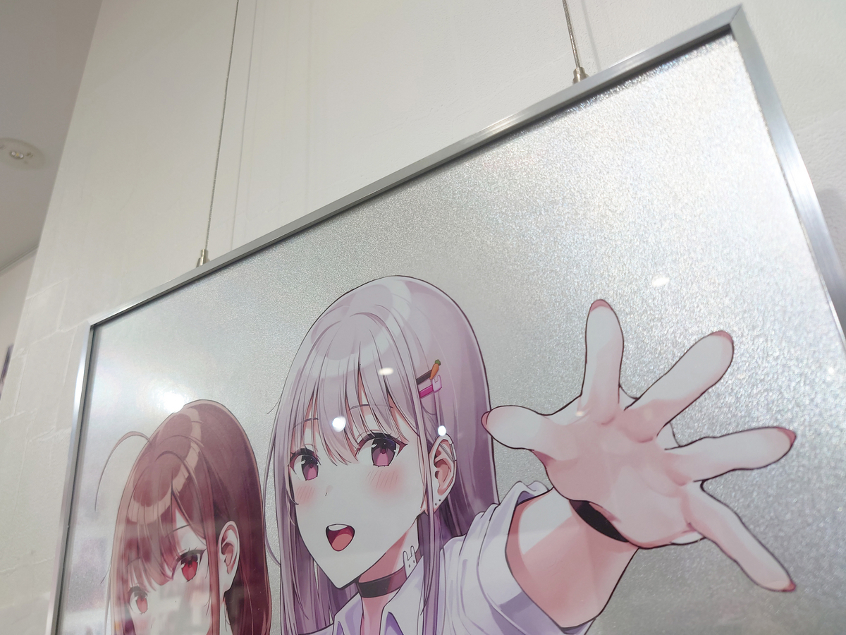 プリントされたアクリル板を2枚重ねることで、奥行きを演出しています。額縁部分とイラスト部分が一体化しているのもポイントです。額縁部分まで透明感があるこの展示方法は、作品のイメージにぴったり!