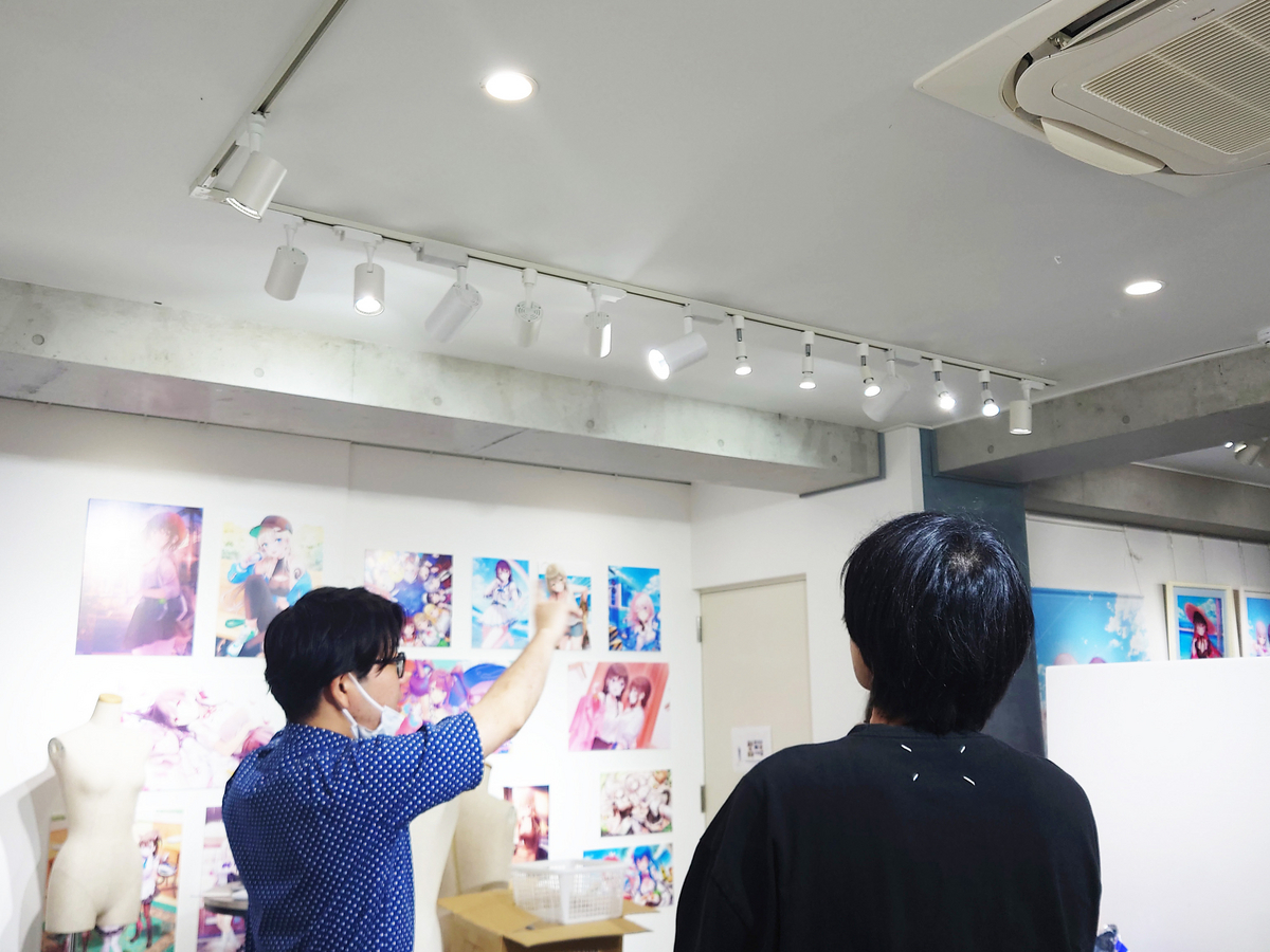 個展の設営は8月1日にまる一日かけて行われましたが、実際の準備は何か月も前からスタートしています。会場の装飾や展示方法、販売グッズなどについて入念に打ち合わせをかさね、準備を進めてきました。