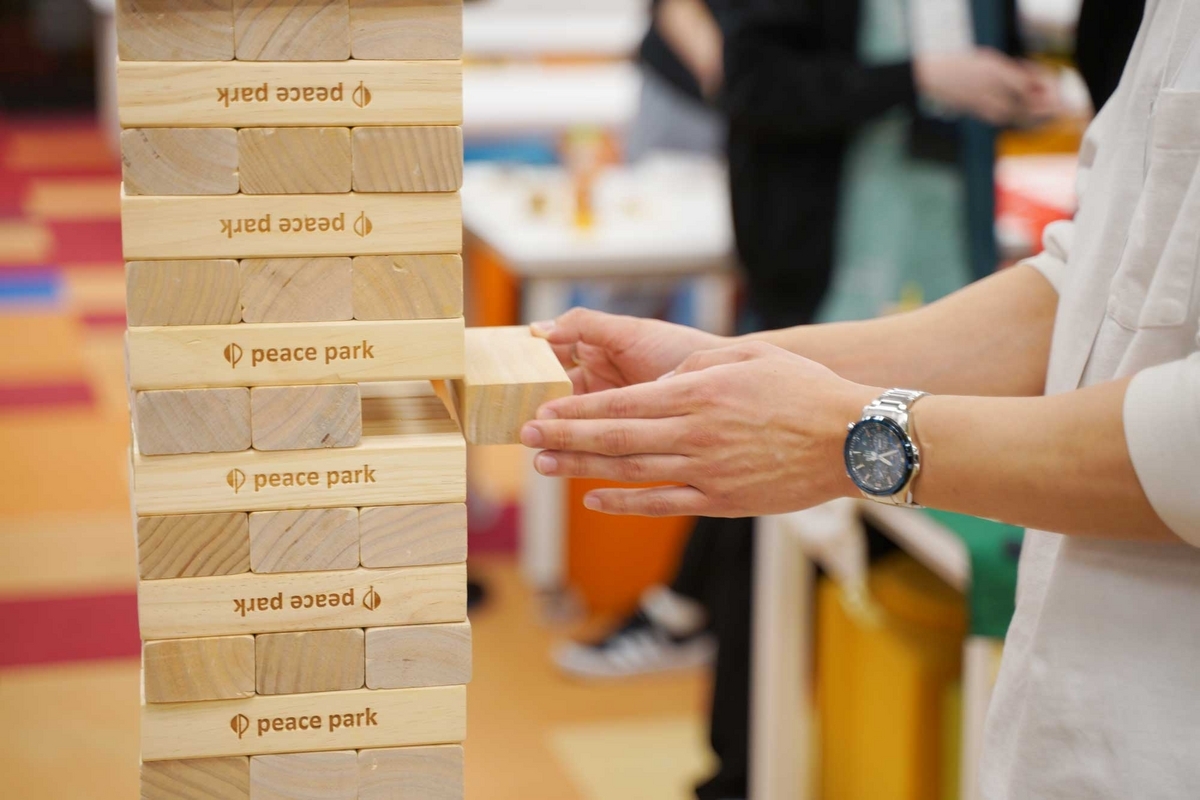 会場にはゲームもいくつか用意されています。人気は巨大ジェンガ。ゲームが長引くほど高く不安定になっていくタワーは見ているだけでハラハラ…観客もどんどん集まり、大きな声援を送っていました。