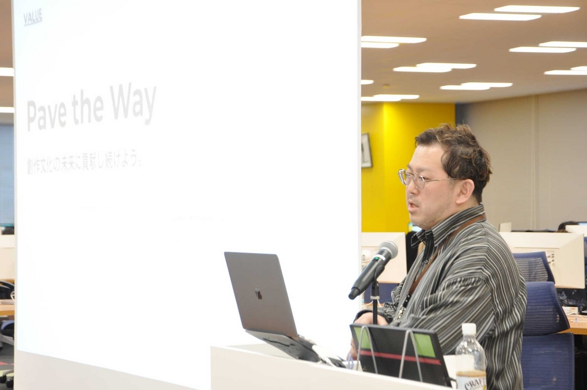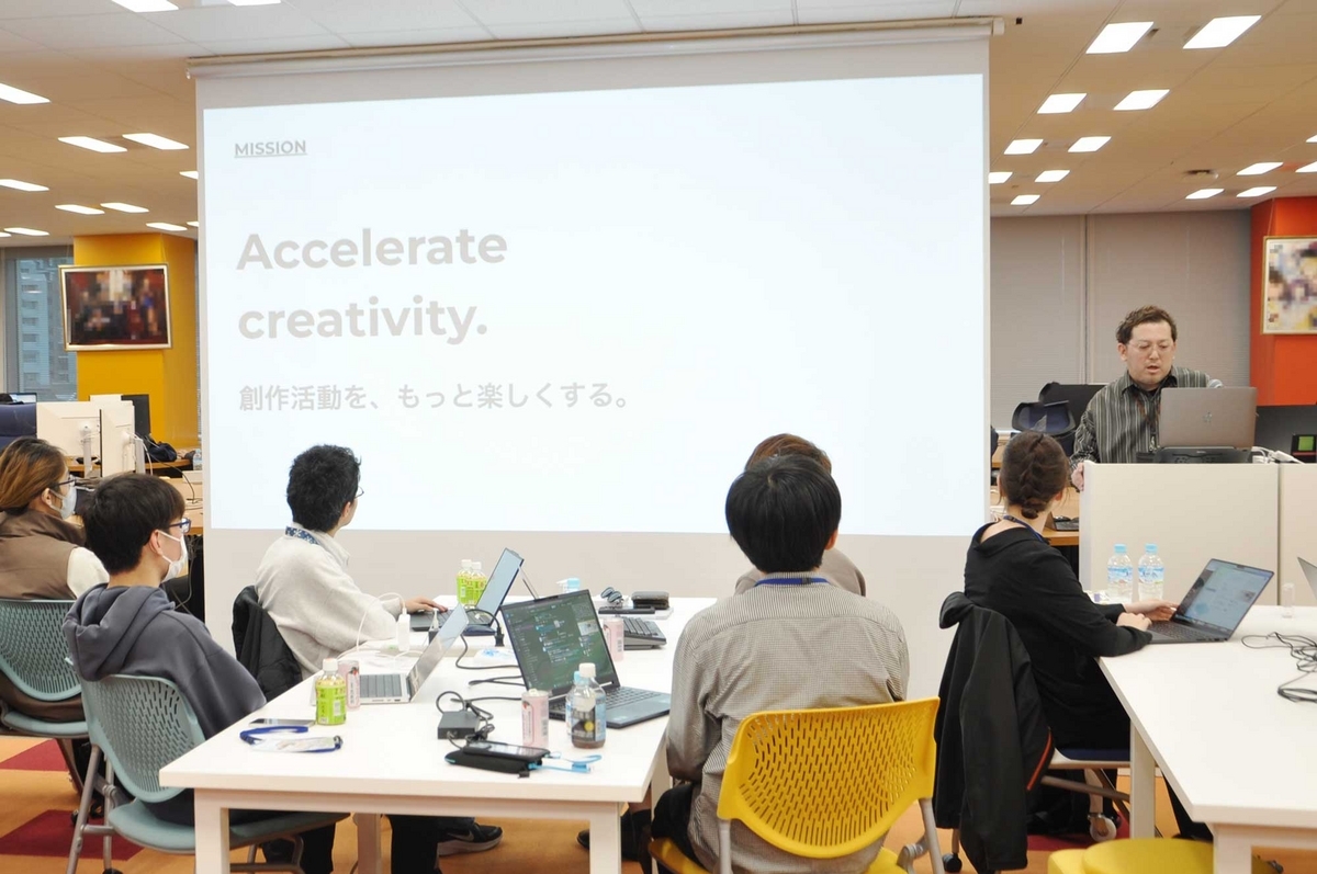 ミッション・ビジョン・バリュー(以下MVV)が、研修全体に組み込まれていることです。 一般的な会社ですと、まずMVVの話があり、その後ビジネススキルなどの研修へ続く流れで、MVVの説明は他の研修と切り分けられていることが多いと思います。ピクシブの研修でも最初にMVVの説明を行いますが、その後の各事業説明でもミッション「創作活動を、もっと楽しくする。」に繋がる形になっているのが大きな特徴です。