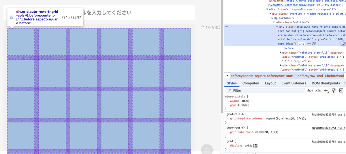 CSS Grid Layout を利用して横6列のグリッドを表現します。このグリッドがタイル移動・変形時の単位として使われます。