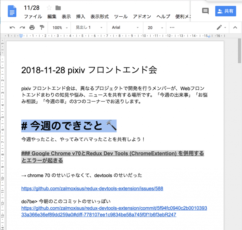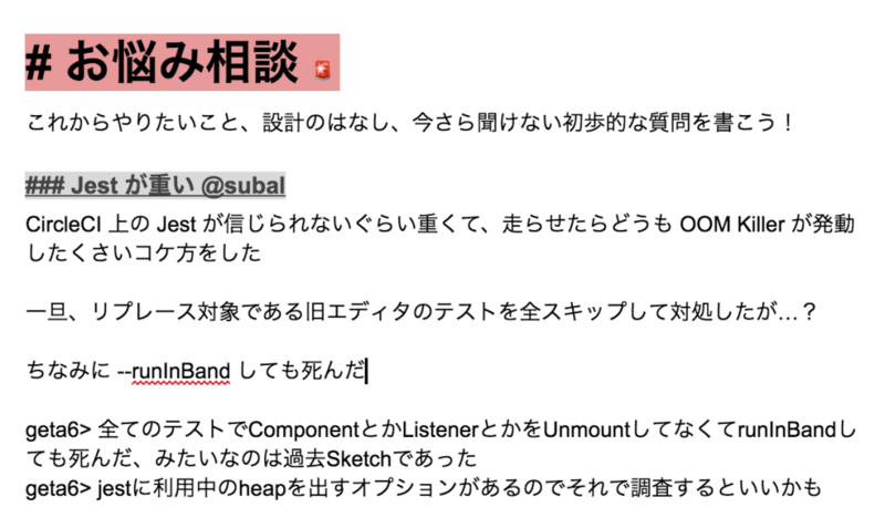 すると「unknown 型がようやく使えるようになったのでこういうケースで使うと良いよー」とか、「前に Draft.js 使ったらこの辺つらかった」といった形で議論が始まるので、その場で Docs に議事を取ります。