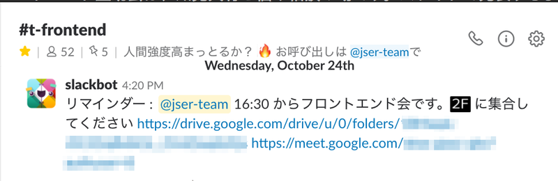 また会の開始ですが、Slack にフロントエンドエンジニアのチャンネルがあるので、そこにリマインダを設置して、時間になるとすぐさま集まれるようにしています。